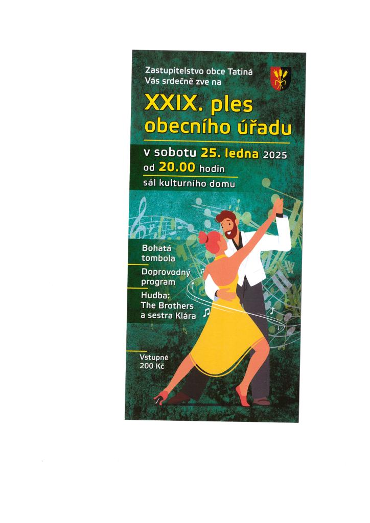 Zastupitelstvo obce Tatiná pořádá XXIX. ples obecního úřadu, který se uskuteční v sobotu 25. ledna 2025 od 20:00 hodin v sále kulturního domu.